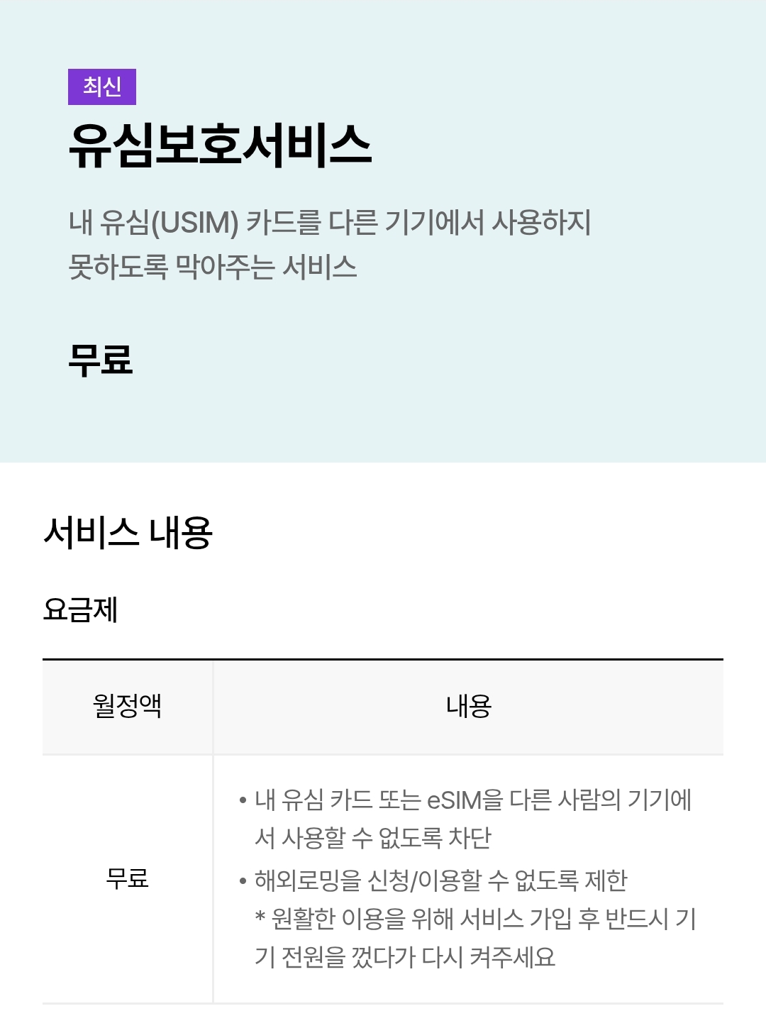 내유심카드 또는 eSIM을 다른 사람의 기기에서 사용할 수 없도록 차단하는 서비스입니다.