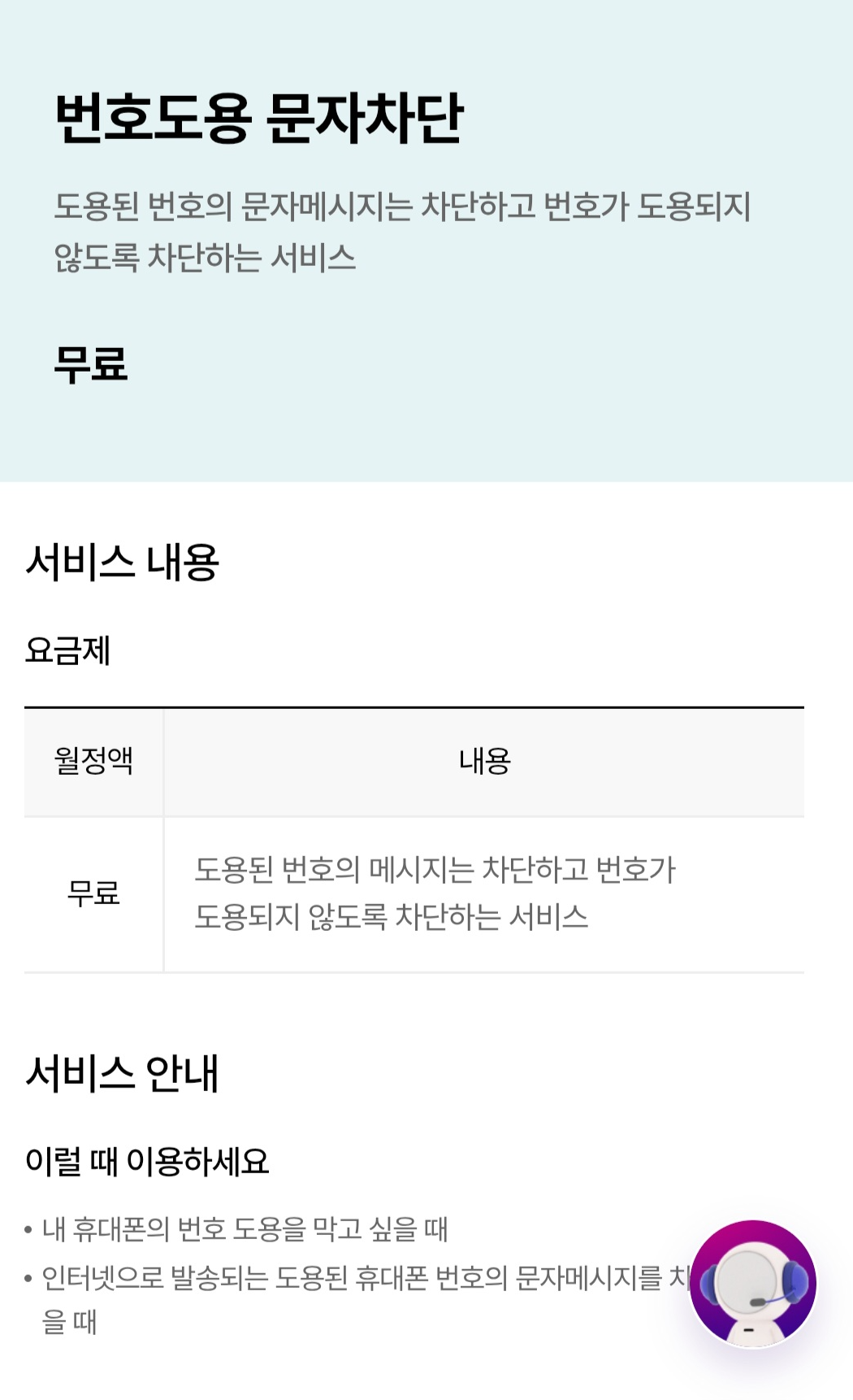 도용된 번호의 문자메시지는 차단하고 번호가 도용되지 않도록 차단하는 부가서비스입니다.